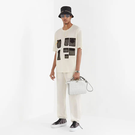 這款吸睛的藍(lán)色T恤,寬松的版型,穿著舒適自在,干凈利落的剪裁,上身挺括有型,采用棉質(zhì)針織面料,整體飾有FF魚(yú)眼圖案印花,一樣便能識(shí)別T恤是出自哪個(gè)品牌,搭配同色系短褲和同色系包包,上街你就是靚的仔!