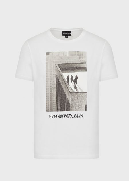 同樣是白T,給予穿著這款服飾的男性非凡魅力,衣身上雕琢出精致的美,以四人聚集在樓頂上的聚會設(shè)計(jì)表達(dá)出了男性的友誼,這灰白的風(fēng)格充滿復(fù)古的韻味,給人一種時(shí)代的聚焦感。圖飾之下是阿瑪尼Logo的標(biāo)識,向世人表達(dá)著這款服飾由阿瑪尼制造,是一款奢侈品服飾。